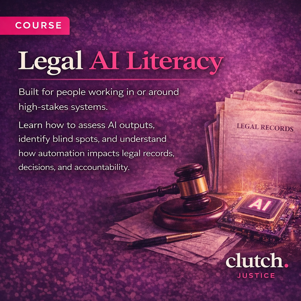 Legal AI Literacy is built for people working in or around high-stakes systems. Learn how to assess AI outputs, identify blind spots, and understand how automation impacts legal records, decisions, and accountability.